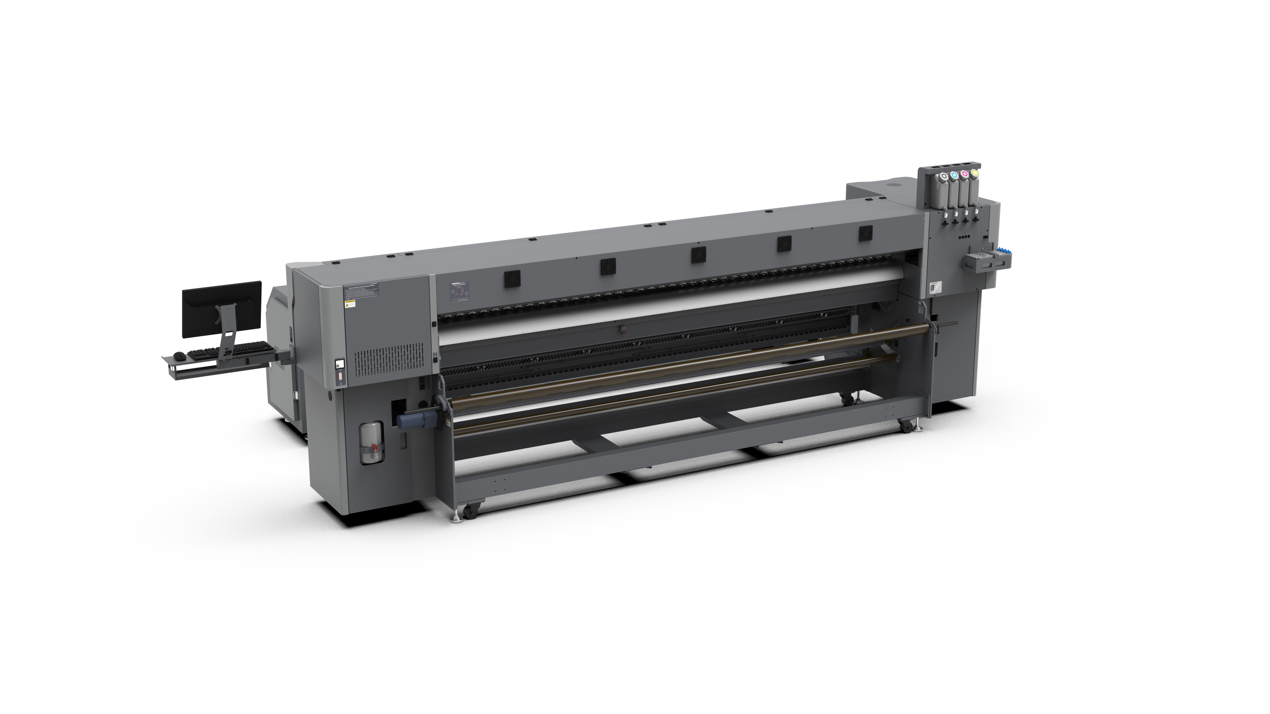 Az opcionális hőfixáló egység akár 150 méter/óra sebességű szublimációra képes, így hatékonyan támogatja a nagyobb volumenű termelést. Az anyagbefűző rendszer állítható vezetőtengellyel van ellátva, amely biztosítja, hogy a textil mindkét oldala azonos feszítéssel haladjon előre, ezzel garantálva a stabil és egyenletes feldolgozást.